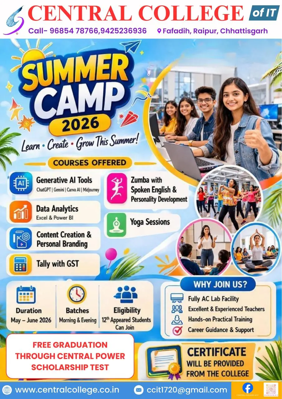Central college visualizes Chattisgarh as a "valley of thoughts and Properity"backed with enriched natural and mineral resource,strong industrial and power sector,excellent educational institution and much more.There always lies a scope for betterment and advancement.Today,the market is moving towards AI.It's the world of comminication where technology,accuracy,reliability and promptness matters a lot.